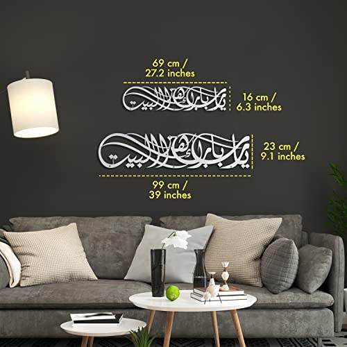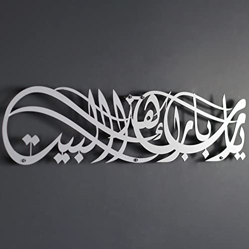 iwa concept - لوحة فنية جدارية إسلامية معدنية بتصميم عبارة (يا رب بارك هذا البيت) دعاء البركة، لوحة فنية للقرآن الكريم وديكور حائط بنمط الخط العربي لعيد رمضان، دعاء للحماية من ايوا كونسيبت مقاس 69×16 سم فضي