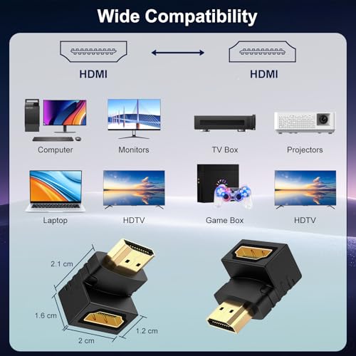 - 6 عبوات تتضمن محول HDMI واحد بزاوية 90 درجة وواحد 270 درجة ذكر إلى أنثى مع جسم قصير، قم بتوصيل الأجهزة بسهولة وثبات دون ثني الكابل، خاصة في حالات التوصيل الضيقة؛ ملاحظة: هذا محول HDMI قياسي إلى HDMI قياسي؛ يرجى التحقق من واجهة جهازك قبل الشراء.