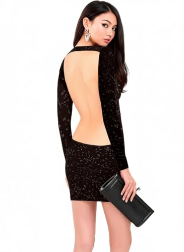 Generic - فستان سهرة قصير بتصميم جاكار مطبوع، أسود، مقاس واحد حتى 75 كجم، بأكمام طويلة وفتحات جانبية