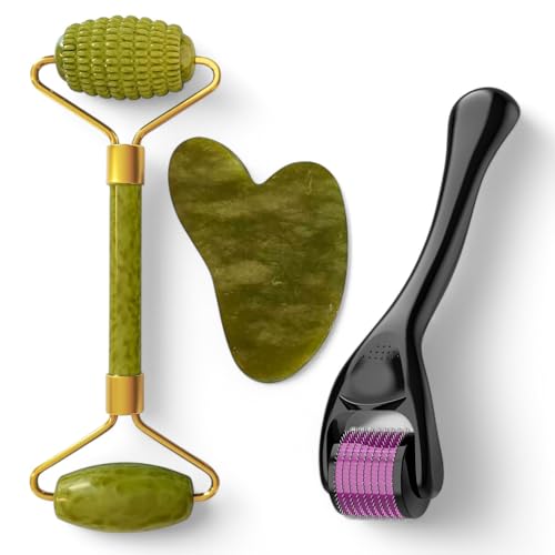 Plan A - مجموعة جييد رولر وجوا شا مع ديرما رولر - أداة تدليك متعددة الوظائف للوجه والعين والرقبة والجسم، مصنوعة من حجر اليشم الطبيعي، تساعد على تقليل التجاعيد والهالات السوداء واسترخاء العضلات