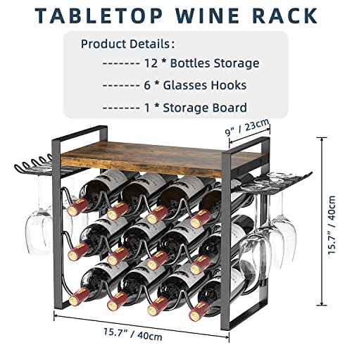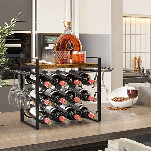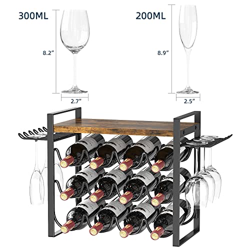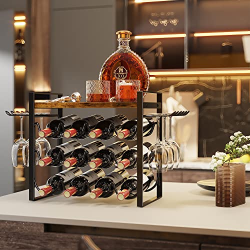 JAFUSI - رف مشروبات مع حامل زجاجي من جافوسي، رف مشروبات باطار معدني، حامل مشروبات مع صينية خشبية، رف زجاجات لديكور المنزل والمطبخ (يحمل 12 زجاجة و4-6 اكواب)