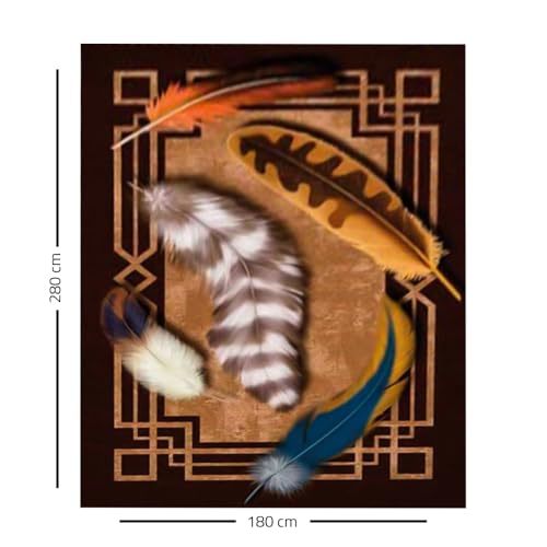 - عناصر التصميم: زخارف ريشية مذهلة تتميز بريش أبيض وبرتقالي وأزرق على خلفية بنية غنية مع حدود هندسية مستوحاة من فن الآرت ديكو