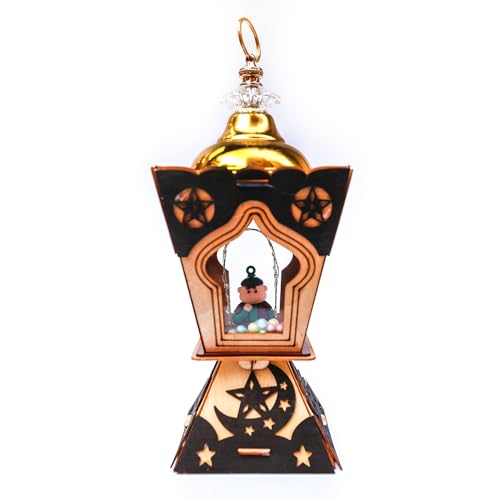 - فانوس رمضان خشبي يتميز بشخصية صغيرة بالداخل، مع نجمة مقطوعة بالليزر وزخارف هلال