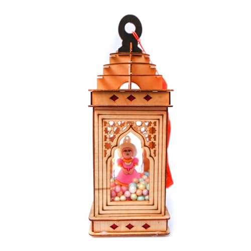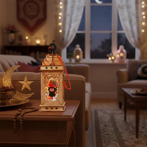 - فانوس رمضان خشبي يتميز بمجسم صغير بالداخل، مثالي للديكور الاحتفالي