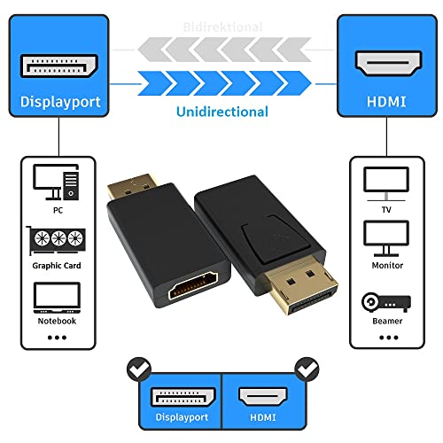 - بفضل محول منفذ العرض إلى HDMI الخاص بنا، يمكنك توصيل أجهزتك التي تدعم منفذ العرض مثل أجهزة الكمبيوتر أو النوت بوك أو أجهزة ماك بالشاشة أو التلفزيون أو جهاز العرض أو جهاز البروجكتور والاستمتاع بإشارات الفيديو بدقة UHD. صناعة عالية الجودة: بفضل جهات الاتصال المطلية بطلاء ذهبي، يمكنك الاستمتاع بنقل إشارة عالي الجودة خالٍ من التداخل. استمتع بتمرير الصوت الخالي من العيوب للقنوات الرقمية 5.1 أو 7.1.