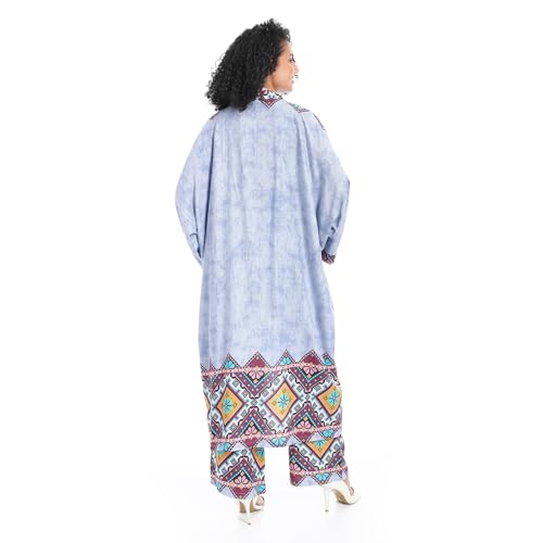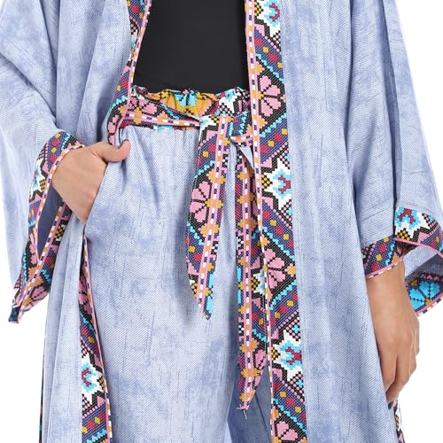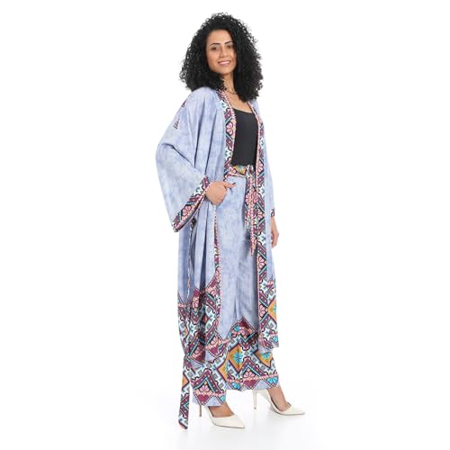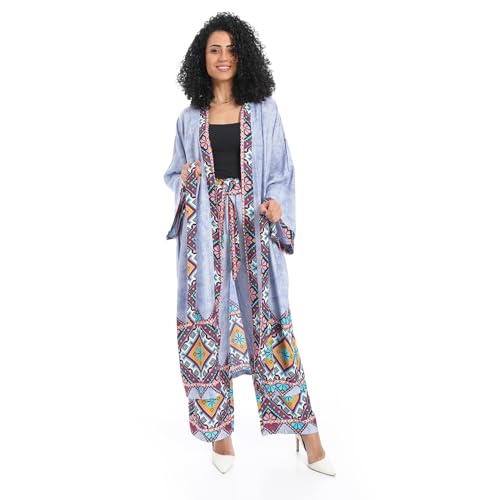 JAMILA - جميلة طقم كيمونو وبنطلون سهل الارتداء بنمط ذاتي للنساء - بدلة كيمونو مثلثة الشكل بلون ازرق فاتح ومسطردة وبورغندي