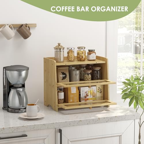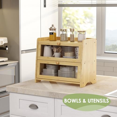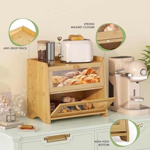 JANSNIMEN - صندوق خبز مزدوج الطبقات لسطح المطبخ من جانسنيمين كبير مع نوافذ حامل خشبي بنمط ريفي خيزران طبيعي