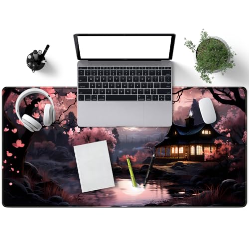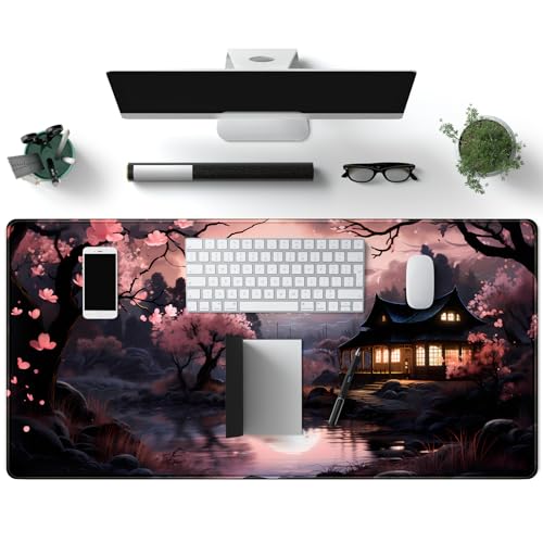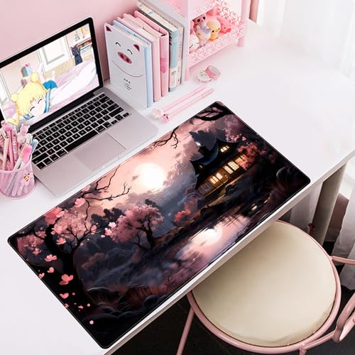 Mechanical Cattle - قاعدة ماوس يابانية بنمط ساكورا بلومز الياباني، وسادة ماوس كبيرة لطيفة بلون أسود ووردي، قاعدة ألعاب ممتدة كبيرة للغاية XXL للكيبورد واللاب توب والماوس لسطح المكتب مقاس 80 × 40 سم، ديكور مكتب