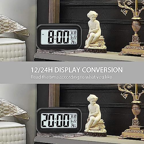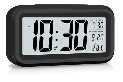 JASIFS - ساعة منبه رقمية للطلاب-جاسيفس للدراسة والمكتب المنزلي وغرفة النوم والمطبخ ومنبه مع مستشعر تلقائي للوقت والتاريخ ودرجة الحرارة سوداء بلاستيك