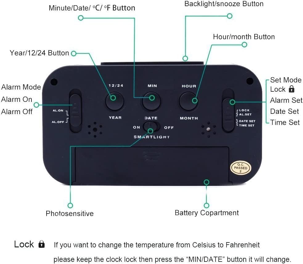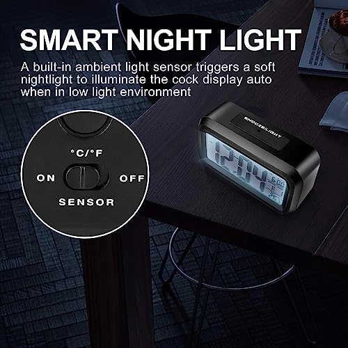 - ساعة منبه رقمية من جاسيفس ضبط دقيق للوقت: الوقت والتاريخ وقياس درجة الحرارة مع مستشعر إضاءة ليلية تلقائي ورؤية ليلية