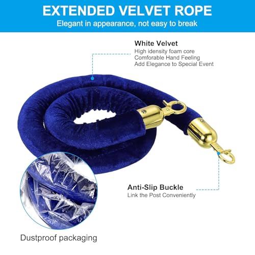 - مخمل أزرق فاخر: الحبل مغطى بقطيفة زرقاء عالية الجودة توفر لونًا غنيًا ومظهرًا راقيًا وراقيًا، مما يرفع من أجواء أي مكان على الفور.