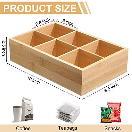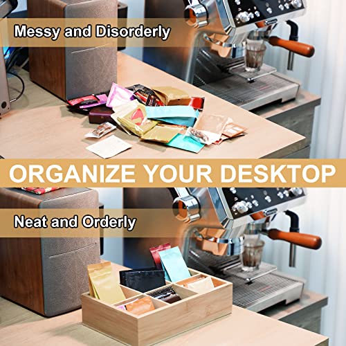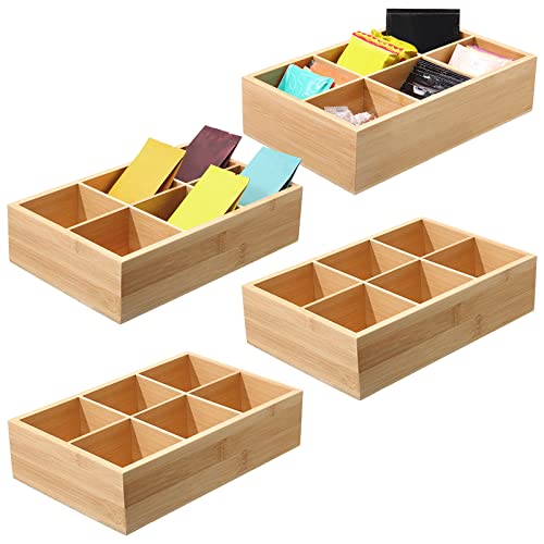 JAZZEEL - حاويات تخزين مقسمة من الخيزران من جازيل، 4 عبوات مع 6 مساحات تخزين لكل منها، صندوق درج شاي خشبي وصندوق تخزين لاكياس الشاي والقهوة والوجبات الخفيفة والسكر، حافظة حامل من الخشب الطبيعي