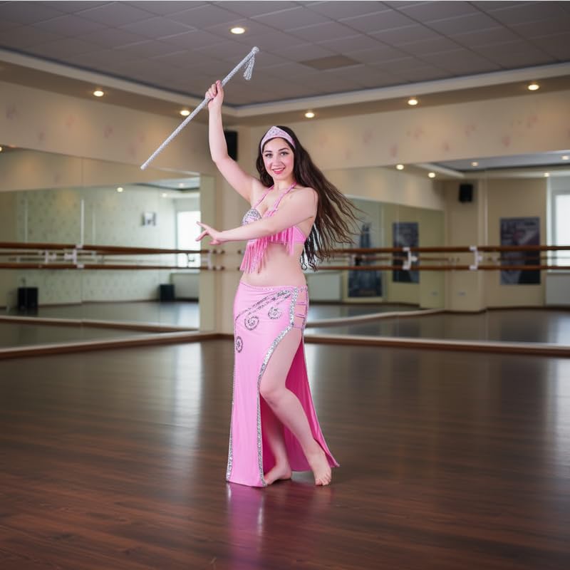 JAZZEEL - طقم زي الرقص الشرقي من جازيل، مكون من قطعتين حمالة صدر وتنورة مع ترتر فضي وشراشيب، زي رقص شرقي بينك للنساء، مقاس قابل للتعديل، مثالي للعروض المسرحية والمهرجانات وحفلات الرقص