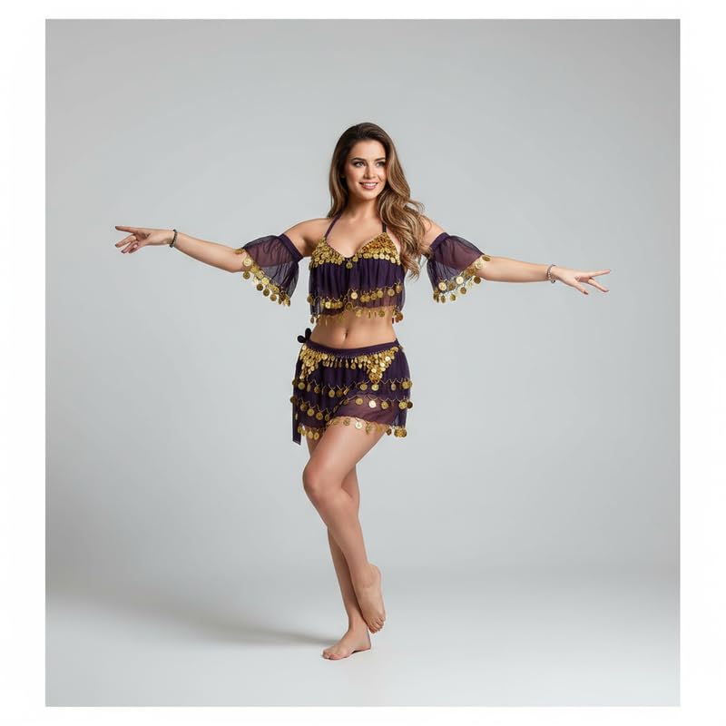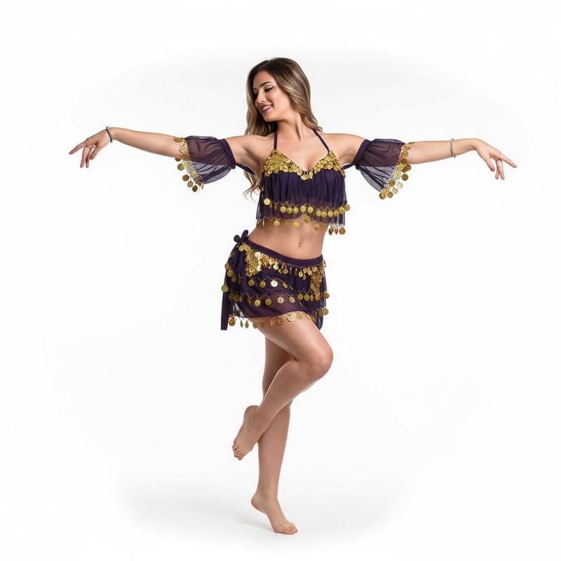 JAZZEEL - طقم زي الرقص الشرقي من جازيل، مكون من قطعتين بلوزة وتنورة باكمام شفافة وعملات ذهبية، زي رقص شرقي اسود للنساء، مقاس قابل للتعديل، مثالي للعروض المسرحية والحفلات والمهرجانات