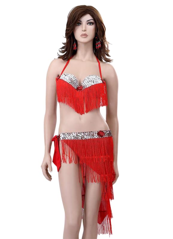 JAZZEEL - طقم زي الرقص الشرقي من جازيل، حمالة صدر وتنورة من قطعتين مع ترتر فضي وشراشيب حمراء، زي رقص شرقي للنساء، مقاس قابل للتعديل، مثالي للعروض المسرحية والمهرجانات والحفلات