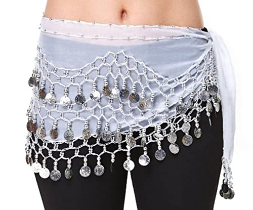 JAZZEEL - وشاح خصر من الشيفون للرقص الشرقي من جازيل، تصميم من 3 صفوف مع عملات ذهبية من جلجلنج، ازرق وذهبي، مقاس واحد يناسب معظم الاشخاص، تنورة بشراشيب لحضور فصول الرق الشرقي والممارسة والمهرجانات