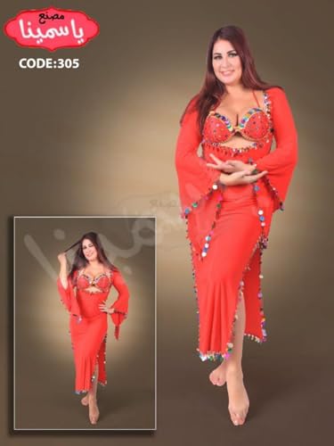 JAZZEEL - زي رقص شرقي مزين بخرز ملون من جازيل، لون احمر، مقاس واحد يناسب الجميع، طقم حمالة صدر وحزام عصري مع خرز متعدد الالوان لاداء النساء، زي رقص شرقي