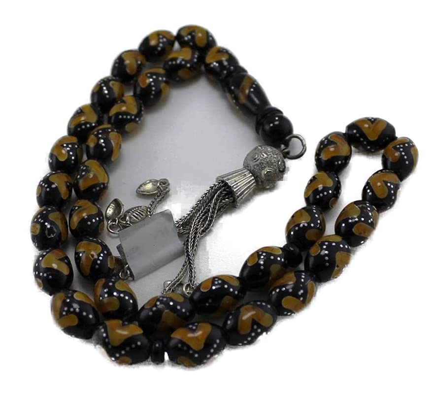 JAZZEEL - سبحة طبخ من جازيل بلون كهرماني وفضي - مسبحة من خشب الكوكا بوزن 45 غرام تتميز بخرز بلون كهرماني ولمسات فضية، اكسسوار صلاة فاخر ومثقل للرجال