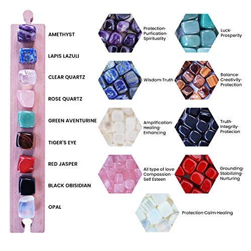 - مجموعة كاملة من 8 أحجار: تتضمن هذه المجموعة المنسقة مجموعة متعددة الاستخدامات من ثمانية كريستالات علاجية شائعة: الكوارتز الشفاف والكوارتز الوردي والجمشت واللازورد والأفينتورين الأخضر وعين النمر والزجاج البركاني الأسود واليشب الأحمر.