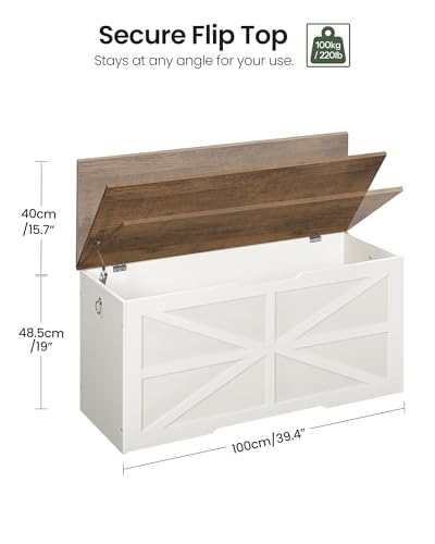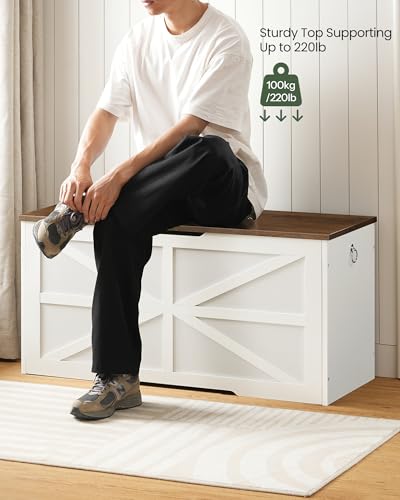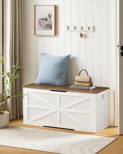 JAZZEEL - صندوق تخزين خشبي عصري مع مقعد من جازيل، منظم مدخل بيت المزرعة مقاس 100 × 39 × 48 سم، صندوق تخزين لنهاية السرير وغرفة المعيشة مع وسادة - جوزي وابيض