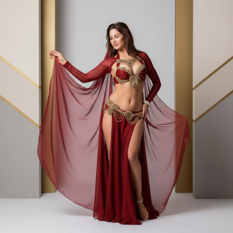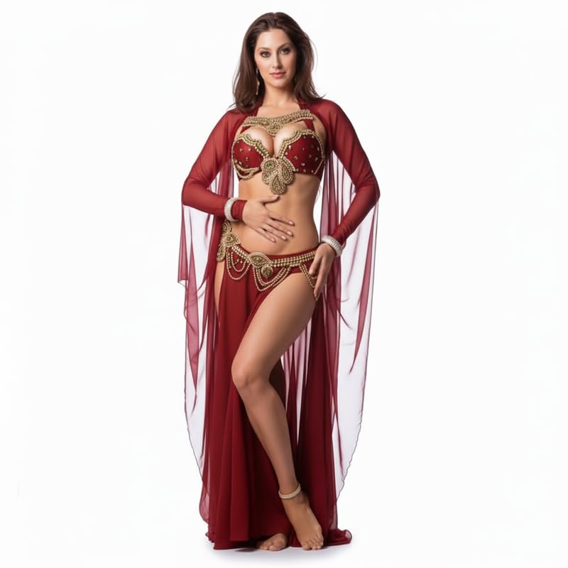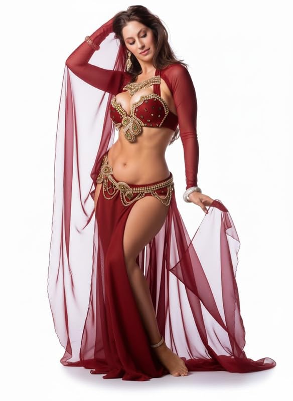 JAZZEEL - بدلة رقص شرقي احترافية مكونة من حمالة صدر وحزام مطرز يدويًا مع سلاسل مطرزة بالخرز وتنورة شفافة بأكمام طويلة من جازيل، قطعتين بدلة رقص شرقي أنيقة للأداء المسرحي