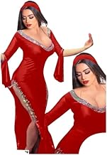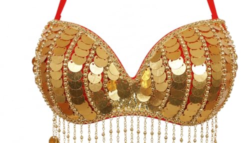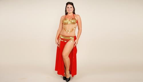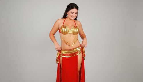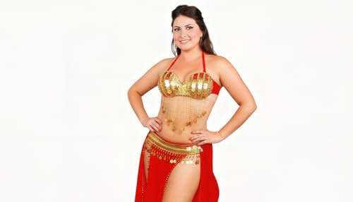 JAZZEEL - طقم زي رقص شرقي احترافي من جازيل، حمالة صدر مزينة بالترتر وحزام خصر مزين بعملات ذهبية، جيبة شفافة مقسمة للأداء المسرحي وراقصات الرقص الشرقي، زي رقص شرقي تقليدي، أحمر