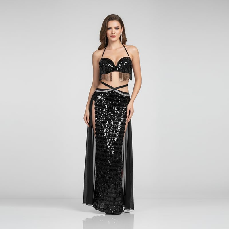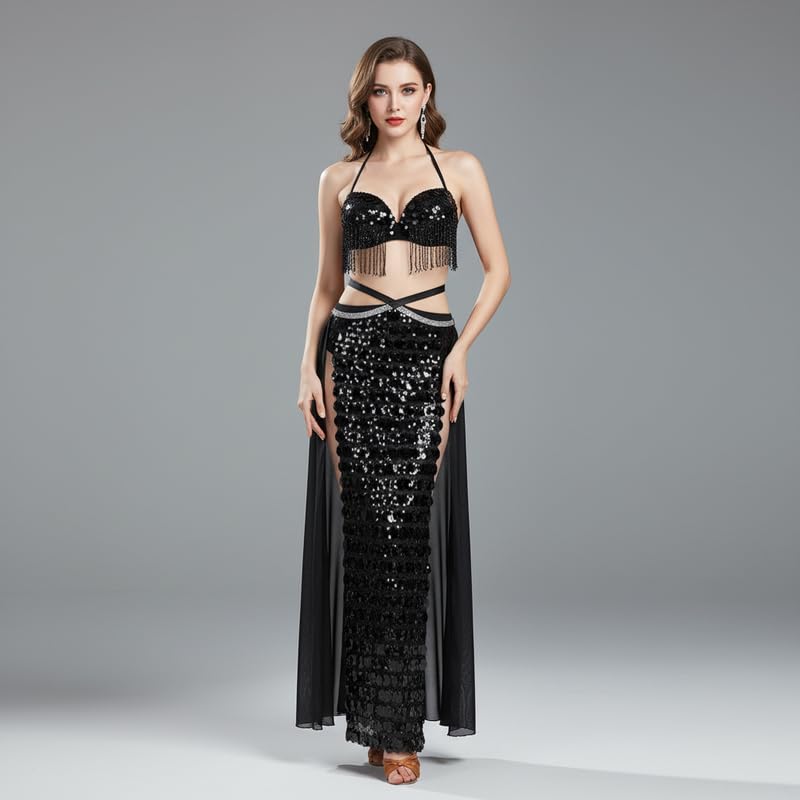 JAZZEEL - طقم بدلة رقص شرقي احترافية مكونة من قطعتين مع حمالة صدر على الرقبة مزينة بالترتر مع شراشيب خرز وجيبة مزينة بالترتر مع ألواح شفافة من جازيل زي مذهل للتمثيل المسرحي وراقصي الكباريه، والرقص الشرقي