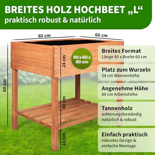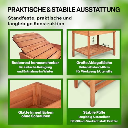 JAZZEEL - سرير حديقة مرتفع من جازيل مع رف تخزين 80 × 60 × 80 سم، صندوق زراعة خشب التنوب مقاوم للطقس مع طبقة بطانة للشرفة والفناء والأعشاب والزهور والخضروات وطاولة بستنة مرتفعة (بني)