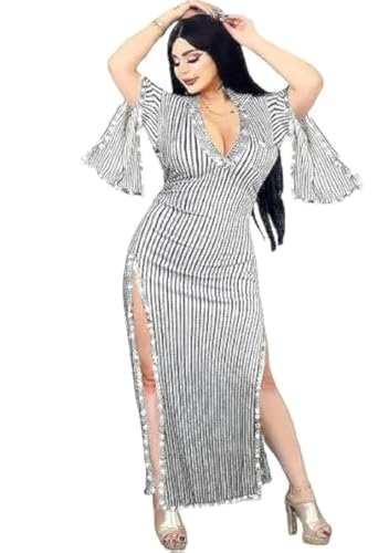 JAZZEEL - فستان جلابية طويل وأنيق للرقص الشرقي بتصميم مخطط، مناسب للعروض أو الحفلات ذات الطابع الشرقي من جازيل للنساء، مع لمسات فضية اللون، مقاس واحد