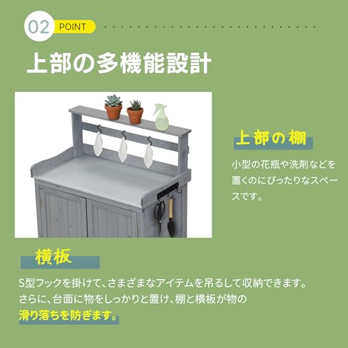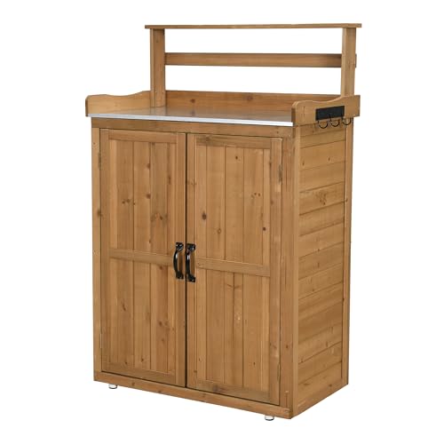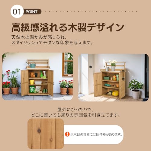 JAZZEEL - سقيفة تخزين خشبية خارجية، مستودع حديقة من الخشب الطبيعي مع طاولة عمل، سقف مفتوح، مع خطافات ورفوف، خزانة تخزين أدوات للأماكن الخارجية والفناء من جازيل، 74 سم × 42 سم × 1.20 م
