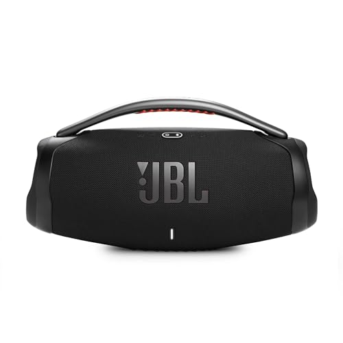 JBL - مكبر صوت بومبوكس 3 من جيه بي ال محمول مع عالي وباس قوي وبطارية تدوم 24 ساعة مقاوم للغبار والماء بتصنيف IP67 تقنية بارتي بوست ومقبض امساك وبث بلوتوث لون اسود JBLBOOMBOX3BLKUK