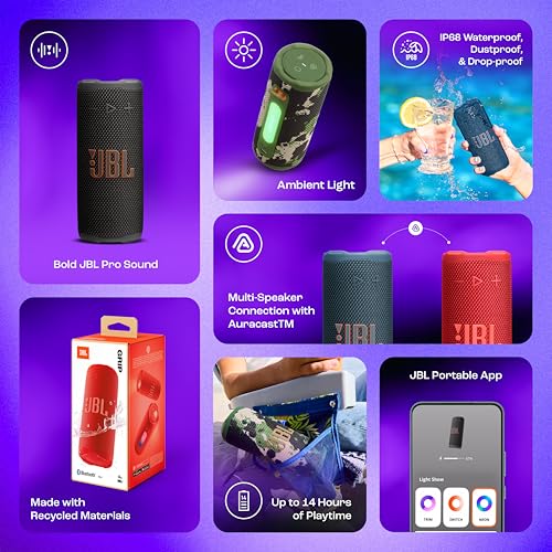 - في أي مكان وفي أي وقت، يوفر مكبر الصوت المدمج جيه بي ال جريب الذي يعمل بالبلوتوث صوت جيه بي ال برو القوي، وتصميم مقاوم للماء، وإضاءة محيطة، ووقت تشغيل يصل إلى 14 ساعة