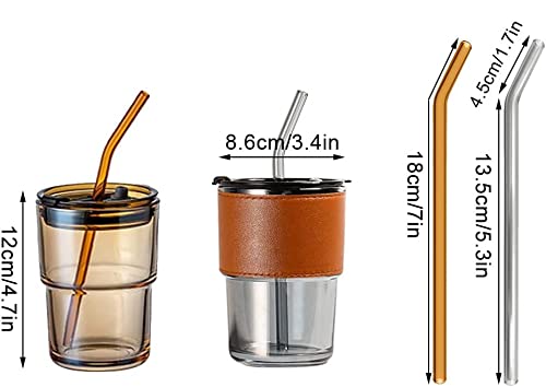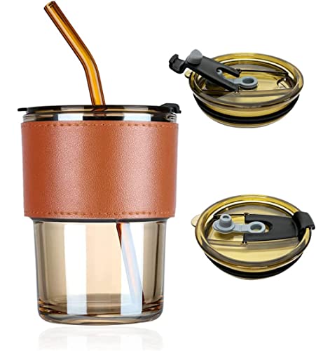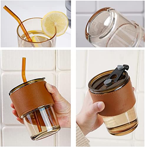 JDF - كوب زجاجي مقاوم للتسرب بمنفذ USB سعة 15 اونصة، اكواب سموثي شفافة قابلة لاعادة الاستخدام مع غطاء مانع وشريط جلدي للحرارة وماصة للمشروبات الباردة والساخنة والقهوة والشاي والمخفوقات