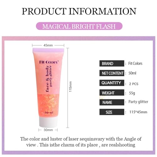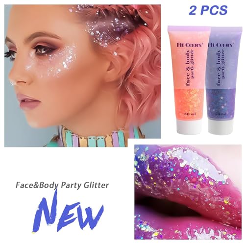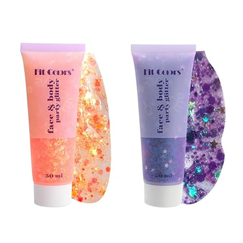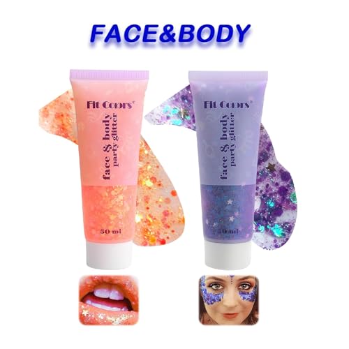 Jemey - جل جليتر من جيمي، 2 قطعة من ملمع الوجه، بخاخ شعر لامع للحفلات والمهرجانات، إكسسوارات فنية للوجه والجسم والأظافر والشفاه والعين والشعر (برتقالي وأرجواني)