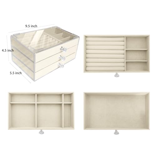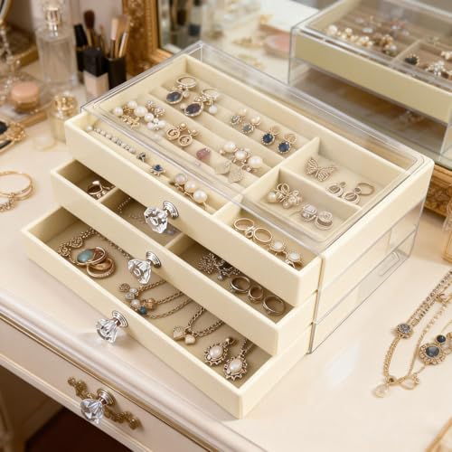 Jemjosh - منظم مجوهرات اكريليك شفاف ببطانة قطيفة مع 3 أدراج بتصميم قابل للتكديس لتخزين الحلقان والسلاسل والخواتم والأساور للنساء من جيمجوش، لون بيج