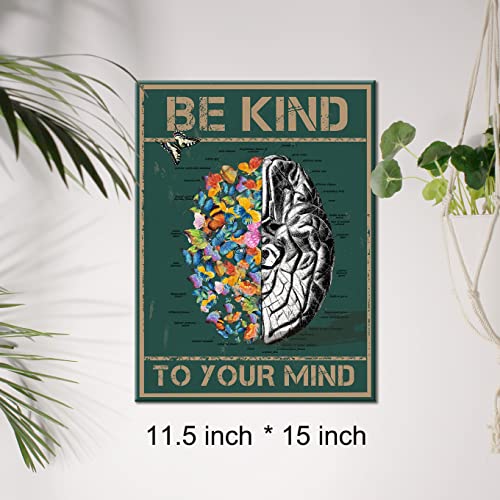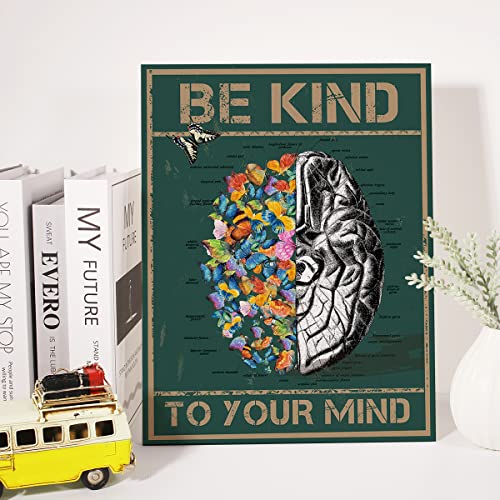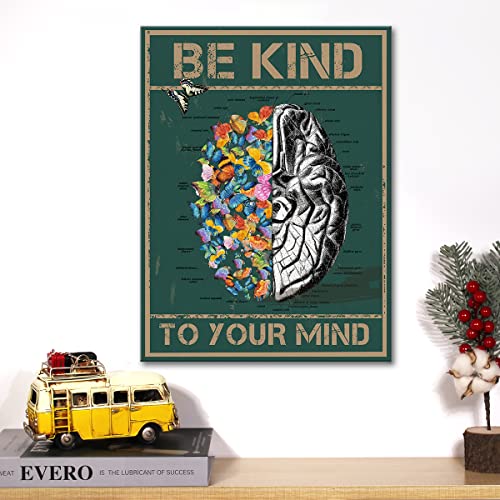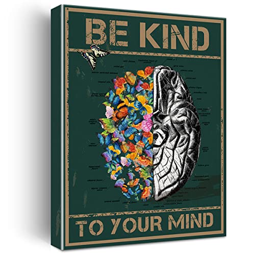 JerLoe - لوحة جدارية قماشية مطبوعة على شكل فراشة وتشريح للدماغ مع عبارة ملهمة "Be Kind to Your Mind" لوحة قماشية وديكور جداري وهدية تحفيزية مؤطرة 29 × 38 سم من جيروي