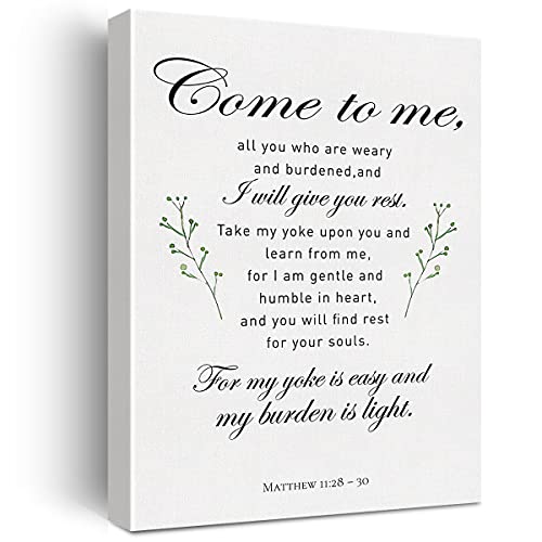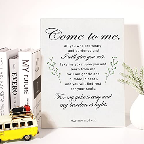 JerLoe - لوحة فنية جدارية من القماش المسيحي ماثيو 11:28 Come Unto Me قماشية مطبوعة ايجابية دينية ديكور جدار المنزل مؤطر هدية الحضانة 12 × 15 انش أبيض