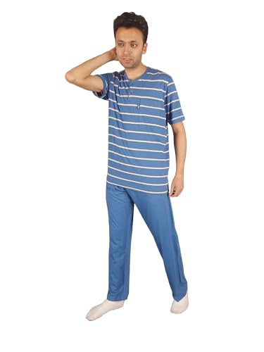 Jet (JET ) - بيجاما رجالي صيفي جاكيت مقلم نصف كم رقبة مستديرة وبنطلون طويل ساده من جيت - جينز