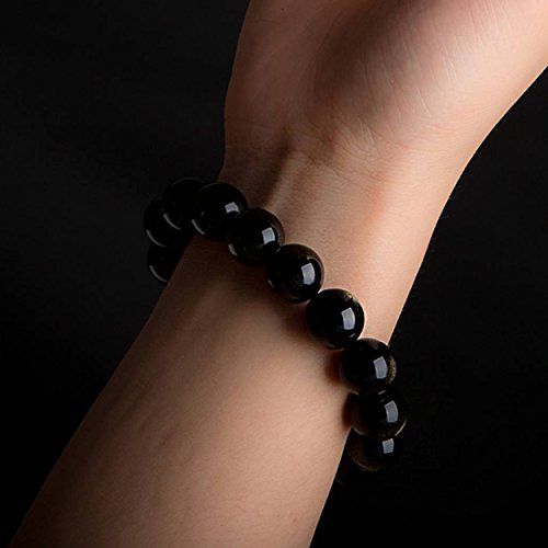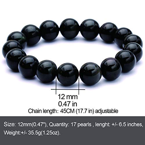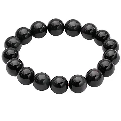 Jewboo - سوار قابل للتمديد من الخرز الاملس احجار كريمة سبج - اوبسيديان بلون اسود طبيعي بتصميم هلال لامع قياس 12 14 ملم للجنسين جيوباو زجاج بركاني