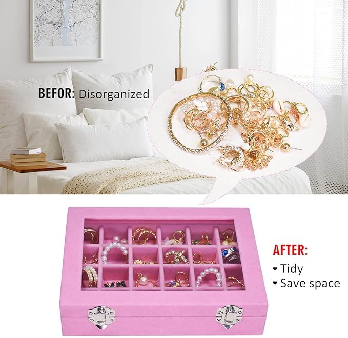 Generic - صندوق مجوهرات مكون من 24 شبكة لعرض المجوهرات والخواتم، صندوق منظم وحامل حلقان للبنات والزوجة والأم والنساء (وردي)