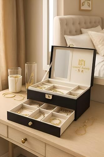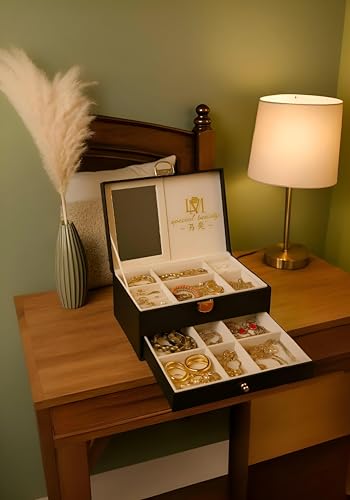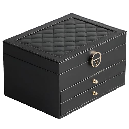 Generic - صندوق مجوهرات - حل تخزين أنيق من الجلد الصناعي بسعة كبيرة مع مساحات تخزين متعددة لتنظيم الخواتم والسلاسل والأساور بتصميم أنيق، (لون أسود)