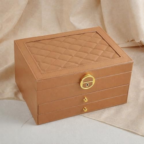Generic - منظم مجوهرات للسفر صندوق اكسسوارات منظم من 3 طبقات مع قفل، حقيبة تخزين متعددة الاقسام للاقراط والخواتم والاساور، حامل ساعة للنساء والفتيات، X-559 (بني)