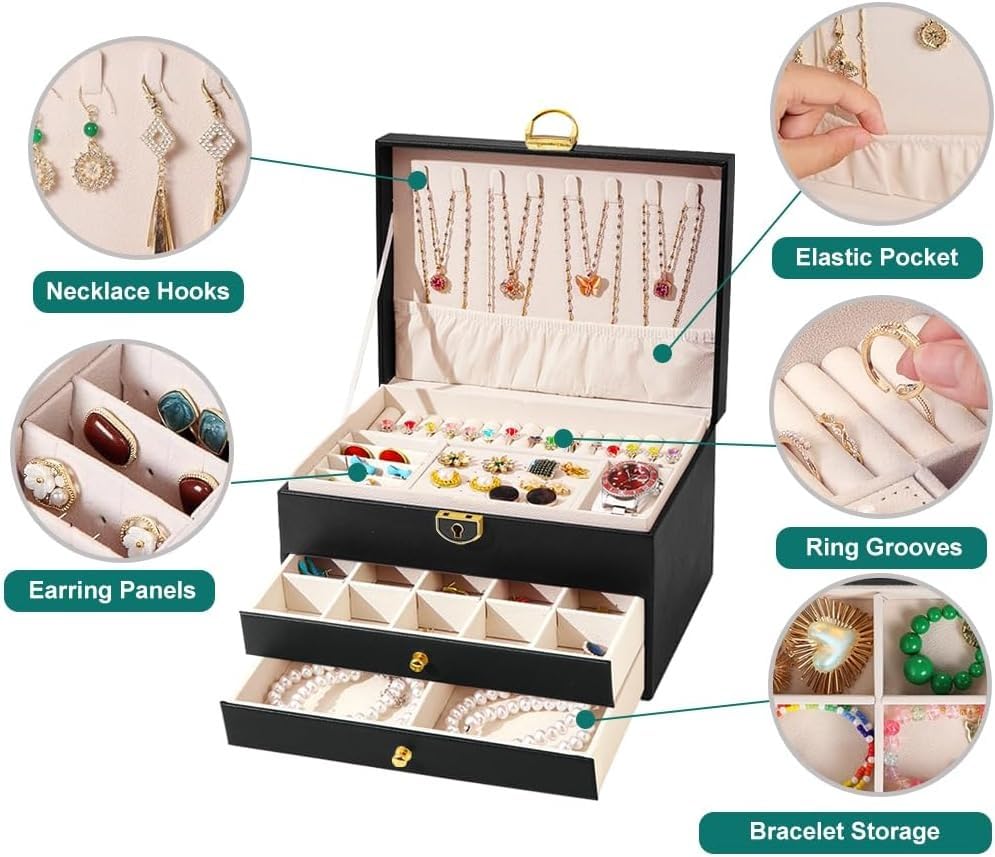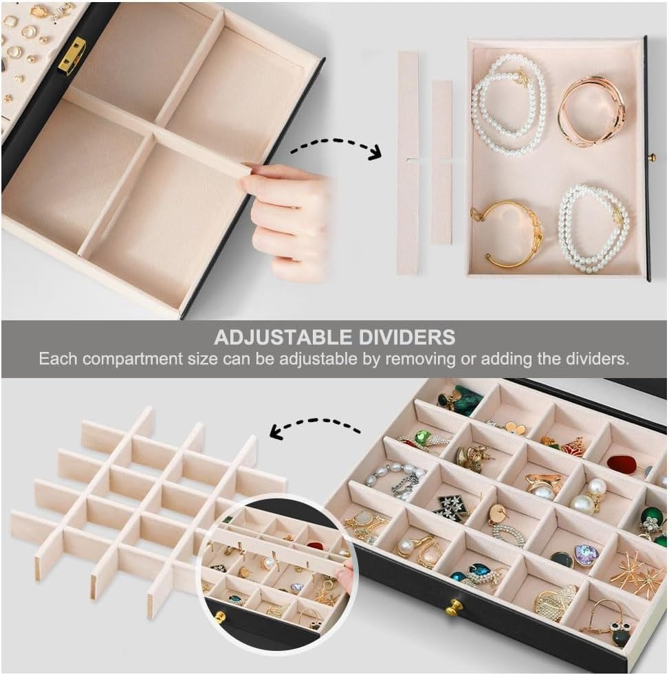 - منظم مجوهرات من 3 طبقات للارتداء اليومي: مساحات مخصصة للأقراط والأساور والخواتم والساعات حتى تستعد بسرعة وتحافظ على القطع غير متشابكة.