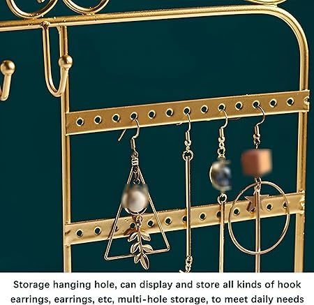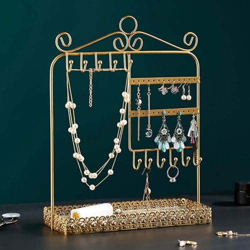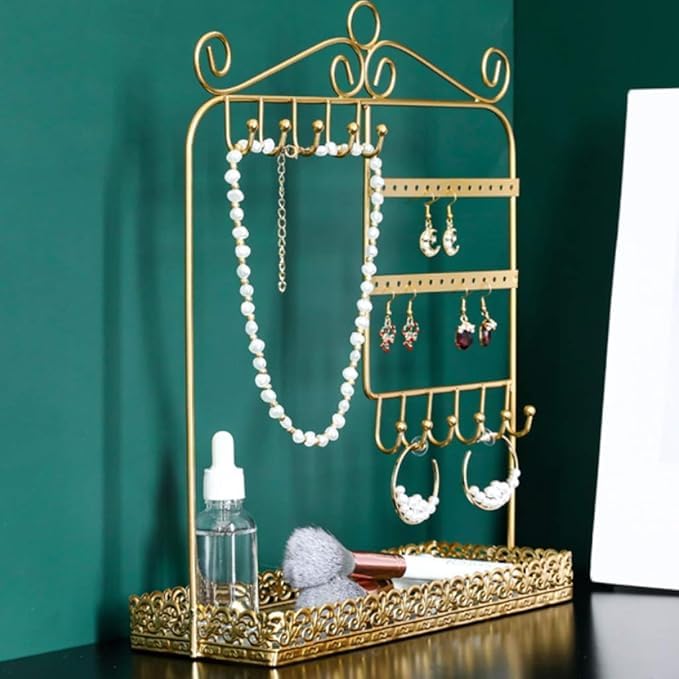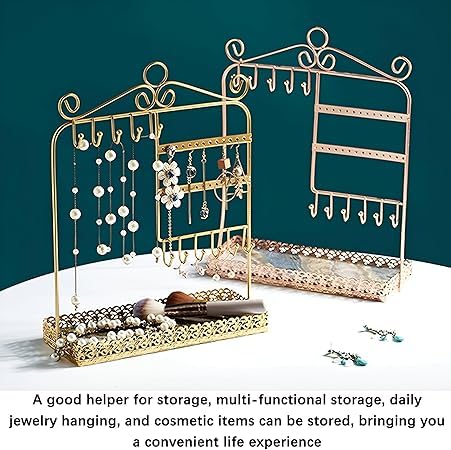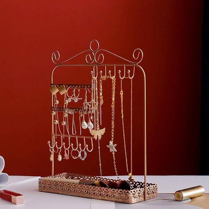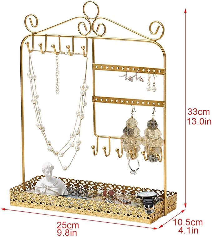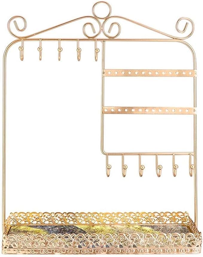 Generic - منظم حامل مجوهرات، حامل عرض معلق للاقراط، حامل عرض معدني منظم مع صينية تخزين للقلائد القصيرة والاساور والخواتم