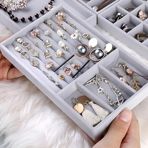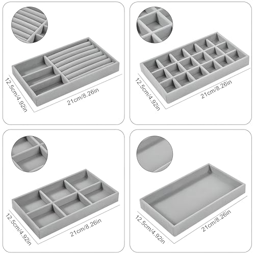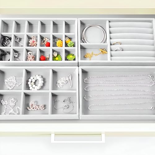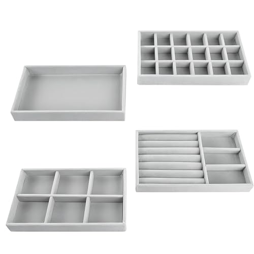Generic - درج تخزين المجوهرات - مجموعة من 4 صناديق مجوهرات قابلة للتكديس لتنظيم الخواتم والحلقان والسلاسل وغيرها (رمادي)، بطانة مخملية للحماية وسهولة الوصول