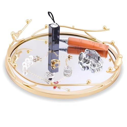 Generic - صينية مجوهرات مراية دائرية متعددة الوظائف بإطار ذهبي وتصميم طيور تعمل أيضًا كصينية مجوهرات أو مراية مكتب مناسبة لتنظيم الإكسسوارات أو زيادة مساحة التسريحة، 25 سم