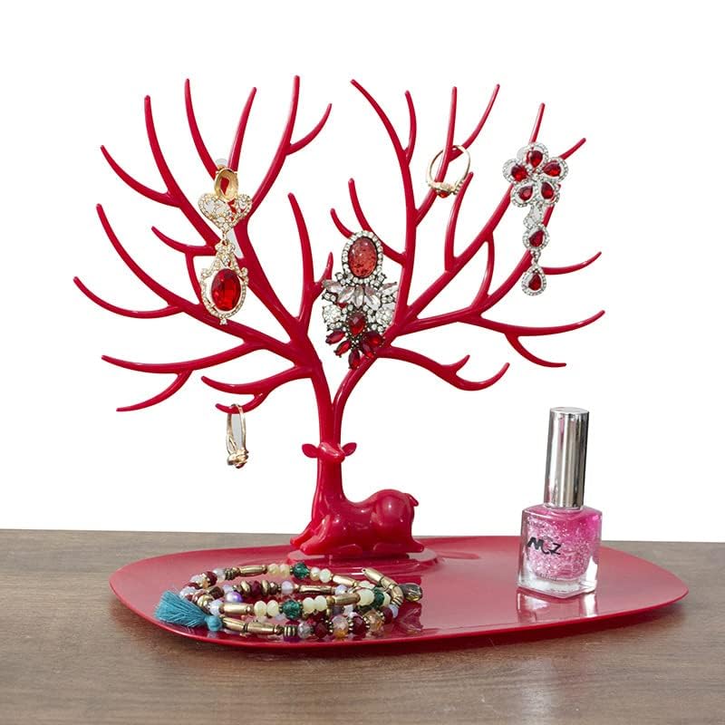 Generic - حامل مجوهرات على شكل غزال على شكل شجرة لعرض المجوهرات ومستحضرات التجميل والحلقان والسلاسل والخواتم والدلايات والاساور، منظم تخزين رف زينة الكريسماس, أحمر, 25*22*15، سنط