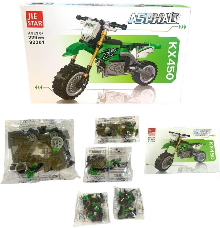 - مجموعة البناء: تتضمن مجموعة بناء الدراجات النارية جي ستار أسفلت KX450 229 قطعة لبناء نموذج دراجة ترابية مفصلة، يوصى بها للأعمار من 6 سنوات فما فوق