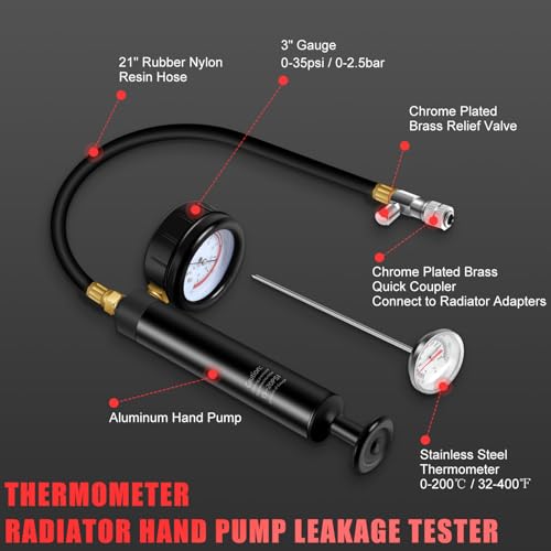- كاشف تسرب المضخة اليدوية ومقياس الحرارة: تستخدم أداة اختبار ضغط الرادياتير أسطوانة مضخة من الألومنيوم بدلاً من البلاستيك وخراطيم راتنج النايلون المطاطية مقاس 53 سم، مع تركيبات نحاسية صلبة ومتينة. مقياس ضغط بميناء عرض كبير 7.6 سم مع نطاق مؤشر (0 إلى 2.5 بار)، سهل المراقبة. ميزان حرارة من فولاذ مقاوم للصدأ مع نطاق مؤشر من 0 إلى 200 درجة مئوية. يتم تضمين سدادات الهواء ذات الأنماط الأمريكية والأوروبية لتختار من بينها. حافظة مخصصة للقولبة تحافظ على كل شيء في مكانه وتحمي المقاييس أثناء التخزين.