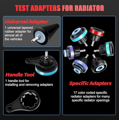 - استخدامات متعددة: تم تجهيز مجموعة أدوات فحص تسرب نظام التبريد مع 17 محول محدد ومحول مطاطي مدبب عالمي، مناسب لجميع أنواع فتحات الرادياتير تقريبًا في المركبات الكلاسيكية والحديثة. تتضمن 3 محولات اختبار غطاء الرادياتير و2 وصلة تساعد على تشخيص تسرب أغطية الرادياتير على معظم السيارات. جميع هذه المحولات مرمزة بالألوان وتوضع حصريًا، ويمكن اختيارها بسهولة وفقًا للصور المحددة في التعليمات، إنها مريحة ولا تسبب أي تشويش.